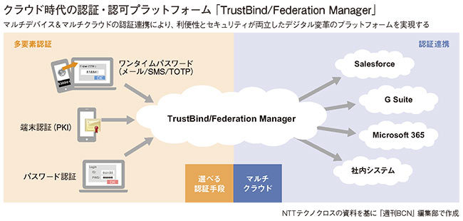 NTTテクノクロスが提供するクラウドセキュリティソリューション「TrustBind(トラストバインド)」は、マルチクラウド、マルチデバイスに対応した認証管理を実現する。マルチデバイス対応のため、PCとスマートフォンの両方のアクセスがあるテレワークにも対応しやすい。「TrustBindは、社内、クラウドに関係なく統合認証、アクセス認可の機能を提供する。多要素認証にも対応し、CASB(Cloud Access Security Broker)のアクセス管理も複合的に提供する」と高橋氏は説明する。