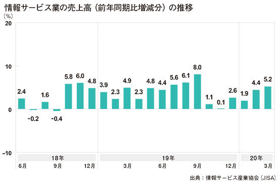 一方、仮に新型コロナウイルスの感染拡大が夏までに収束したとすれば、自動車をはじめとする産業分野の回復も早まることになる。情報サービス業の売り上げや利益も下期(20年10月-21年3月)に巻き返して、「通期で前年度比トントンまで持っていける望みはまだある」とのSIer幹部の声も聞こえてくる。