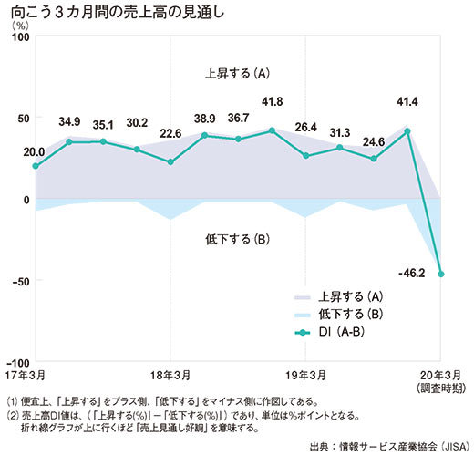 業界全体を見渡すと、昨年度(2020年3月期)までは良好な受注環境が続いており、多くのSIerが増収増益を達成している。経済産業省が毎月発表する「特定サービス産業動態統計」をもとに情報サービス産業協会(JISA)が作成した、情報サービス業の売上高推移でも、3月までは前年同期比プラスで推移。しかし、同じくJISAが3月時点で調査した向こう3カ月の売上高DI値の見通しでは、売上高が減少する方向へと急降下している(図参照)。