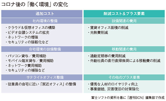 具体的には、従業員の自宅と業務システムを安全に結ぶネットワークの構築や端末類の貸し出しが、追加的な費用として発生する一方で、従来の賃貸オフィス面積の縮小や光熱費の低減、通勤定期券や外勤社員の直行直帰による移動費の削減などのコスト圧縮効果が見込める。もちろん事業継続や災害復旧の対策を強化できるほか、子育て世代を中心に優秀な若手人材のロイヤリティ向上の効果が期待できるとしている(図参照)。