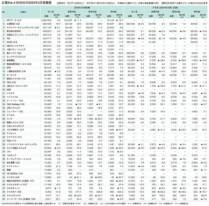 主要50社のSIer決算を俯瞰すると、昨年度は良好な受注環境に支えられるかたちで増収増益の決算が目立つ。しかし、今年度はコロナ・ショックの影響で業績見通しを出せないSIerも少なくない。最大手のNTTデータは、コロナ禍の被害が甚大な欧米市場を中心に海外売上高が全体の4割ほどを占めることもあり、今期業績見通しは合理的な算定が困難だとして開示していない。野村総合研究所(NRI)も通期業績の予想は出しているものの、上期についてはコロナ・ショックの影響が大きく見通しが難しいとして非開示。TISも通期予想のみの開示となった。