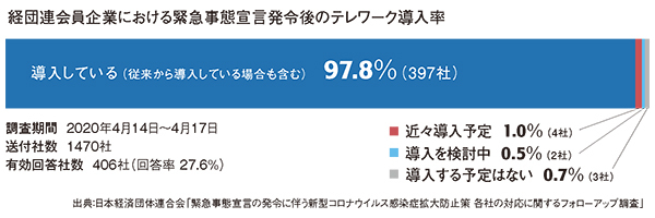 経団連が会員企業を対象に4月に実施した調査によると、有効回答が得られた406社のうち、テレワークや在宅勤務を導入していると回答した企業は397社。全体の97.8%に上り、大企業でのテレワーク導入が促進されていることが明らかになっている。