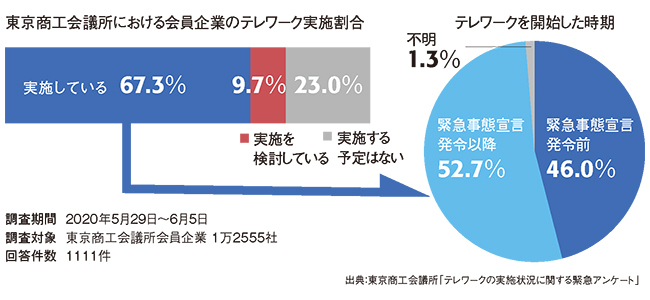 主に中堅・中小企業から構成される東京商工会議所の調べでは、3月の調査(回答数1333社)でテレワークを実施している企業は26.0%だったが、6月の調査(回答数1111社)では67.3%と、41.3ポイントも増加している。テレワークを実施している企業のうち半数以上が緊急事態宣言発令以降に開始したと回答しており、中小企業においてもテレワークが一気に浸透していることがうかがえる。また、従業員30人未満の企業のテレワーク実施率は45.0%だが、30人以上では74.1%、300人以上では90.0%と、従業員規模が大きくなるに従い実施率が高いことも明らかになっている。これらの調査からもわかるように、テレワークの導入が急速に拡大しており、それに伴ってPC市場も活性化しているのだ。