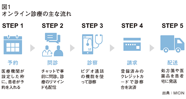 MICINでは、オンライン診療用の専用アプリを独自に開発。患者はスマートフォンを使って、病院や診療所の予約からチャットによる問診、ビデオ通話を使った診察、クレジットカード決済、処方箋や医薬品の発送まで、トータルでサービスを受けられる(図1参照)。専用アプリの利用料がかか1るが、感染予防や通院する時間の節約のメリットのほうが大きいと感じる患者は多いという。同社のオンライン診療サービスを利用する医療施設数は4月時点で3000件だったのが、6月時点ではすでに4000施設を超えている。