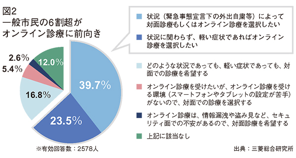 コロナ禍によって患者側の意識も変化している。三菱総合研究所(MRI)と医療情報システム開発センターが一般市民を対象とした意識調査を4月30日に行ったところ、有効回答数2578人のうち6割超がオンライン診療に前向きという結果が出た。