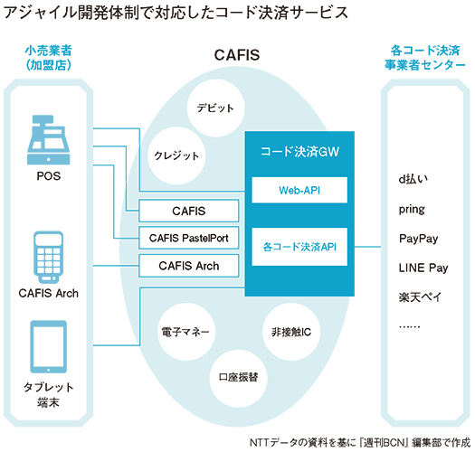 そして1984年からサービス提供している国内最大のキャッシュレス決済総合プラットフォーム「CAFIS」の開発プロジェクトにおいて、SAFeをいち早く適用した。ミッションクリティカルなシステムの代表例であるCAFISをだが、決済サービスの種類が増えるなど取り巻く環境の変化は激しい。特に最近では、コード決済(QR/バーコード)のように全く新しい決済手段が登場し、それにいち早く対応させる必要があった(右図参照)。