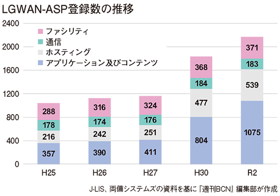 J-LISはLGWAN-ASP登録数の推移を定期的に公表しているが、最新の登録数を見ると、サービス層別に「アプリケーション及びコンテンツサービス」が1075、「ホスティングサービス」が539、「通信サービス」が183、「ファシリティサービス」が371となっている(次頁グラフ参照)。このうち、地方自治体がユーザーとして直接利用するサービス層はアプリケーション及びコンテンツサービスだが、この層だけでも、登録数はこの5年間で650以上増えている。LGWAN接続サービスの潜在的市場は急速に拡大していると言ってよさそうだ。両備システムズの宮宅俊輔・営業本部クラウドサービス営業部主任も「非常に有望な市場だと考えており、LGWAN接続関連サービスは当社にとっての注力事業と言える」と話す。