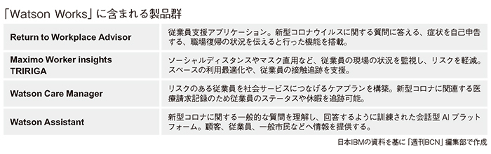 IBMは、職場復帰の課題をさまざまな側面から支援する製品群の「Watson Works」を提供しており、これにはAIプラットフォームや各種の職場復帰アプリケーションが含まれる。それらの製品を活用すると同時に、コンサルティングやシステム構築のサービスも併せて提供し、職場復帰やその後のさらなるビジネス環境の効率化まで支援する、IBMのトータルなサービスとなる。