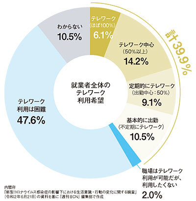 また、就業者全体において今後もテレワークを続けたいと答えた人の割合は39.9%に達した。つまりコロナによってテレワークのメリットを理解し、今後も働き方の選択肢として取り入れていきたいと考えているのである。