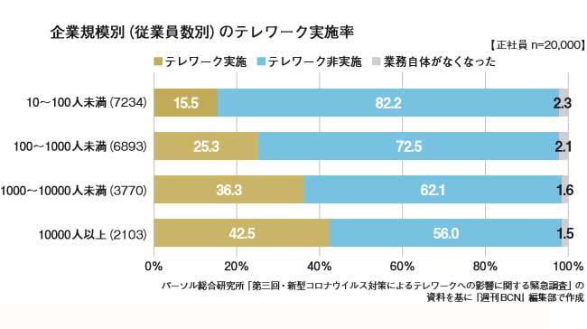 テレワークの実施状況は、企業規模別にみるとどうか。パーソル総合研究所が今年6月に行った調査によると、従業員が1万人以上の企業でテレワーク実施率が42.5%であるのに対し、1000人~1万人未満が36.3%、100人~1000人未満が25.3%と減っていく。そして100人未満では15.5%と、1万人以上のおよそ3分の1しか実施できていない。企業規模が小さいほどテレワークが進まなかったことが分かる。社内体制のデジタル化、オンラインコミュニケーションツールの整備が遅れている中小企業が多いことも、その一因と考えられる。