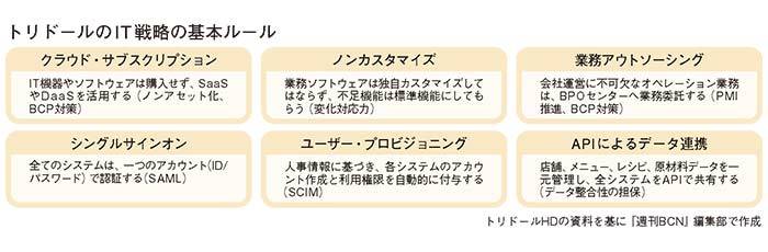 トリドールグループは経営方針に沿ったビジネス基盤として情報システムの整備を進めるべく、六つの基本方針を定めている(右図参照)。そのうち、業務システムやオペレーション業務の在り方として定めているのが、「クラウド・サブスクリプション」「ノンカスタマイズ」「業務アウトソーシング」の三つだ。