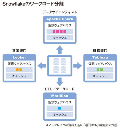 Snowflakeでは、ワークロードごとにクラスタを用意する。「コンピュートレイヤーとストレージレイヤーが分かれており、一カ所のストレージに対し複数のクラスタからアクセスする」(同)。これで競合は発生せず、どのワークロードにも独立した形で必要な処理性能が確保できる。性能が足りなければ、足りないワークロードのクラスタノードを追加するだけだ。Snowflakeは、一つのテーブルも内部的には数千、数万のファイルで構成される。細かく分割することで、クラウド本来の拡張性を最大限に生かせるようになっている。これはオンプレミスのものをクラウド化している製品では、真似のできないものだ。