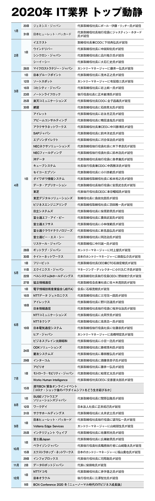 1年前には誰も想像だにしていなかった、新型コロナウイルスによるパンデミック。緊急事態宣言を受けた期初時点では多くの企業が業績見通しを未定とするなど、先行きの見えない状況に突入した。事態の収束がいつになるかは今もわからない。しかしこの秋以降、主要ITベンダーからは前年並みの着地を見込む予測も相次いで発表されており、国内IT業界全体について言えば、新型コロナ禍を何とか乗り切ることができたと言えそうである。2020年の業界に何が起きていたのか、週刊BCNの紙面を通じて振り返ってみよう。 (構成/日高 彰)