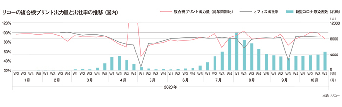 オフィス向けの複合機については、オフィスへの出社率が下がると如実にプリント枚数が減る傾向が見られる。リコーがオフィスへの「出社率」と、複合機の「プリント出力枚数」、新型コロナの「感染者数」の三つの要素を重ね合わせて分析した結果、出社率とプリント出力枚数に強い相関関係があることが明らかになった。ただし、日本のように感染者数が増えてもオフィスへの出社そのものを強く抑制しない国・地域であれば、新規感染者数の増加とプリント出力量の減少が必ずしも連動しないことも分かっている。(図参照)。