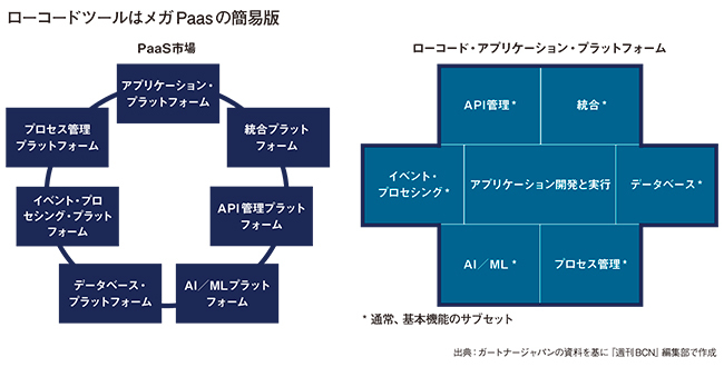 ローコードのツールはここ数年で多機能化が進んでいる。そのイメージは、メガクラウドが提供するPaaSの簡易版だと飯島アナリストは説明する。従来のローコードツールは、プログラミング作業のビジュアル化、高速化が中心だったが、最近では内部にデータベースを搭載するものや、API接続やプロセス管理、AIなど、開発に使える機能を備えるものが増えている。テスト機能を含むものもある。一つのツールで複雑なアプリケーションも作れるプラットフォームとなってきている。