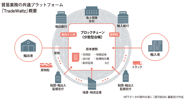 貿易業務は“海上保険の仕組みが確立してから百数十年変わっていない”とされるほど古い業務フローで、紙の書類やPDFファイルが荷主や船会社、保険会社、銀行などの間でやりとりされている。NTTデータはブロックチェーンの技術でデジタル化、自動化できると考え、貿易業務に関わる会社とともにTradeWaltzのサービスを立ち上げた。NTTデータの冨安寛・執行役員技術革新統括本部長は「立ち上げてすぐに十分な利益が出るとは限らないが、確実にビジネスになる」と手応えを感じるとともに、当初の目論みどおり貿易業務の作業量の半減を達成できれば、「協調領域を担う共通プラットフォームの成功例になる」可能性が高い。
