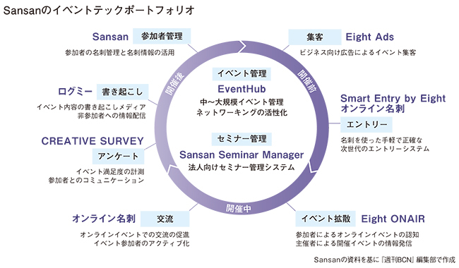 名刺管理サービスを提供するSansanは、2020年10月から新規事業としてB2B向けのイベントテック事業を開始している。サービスの自社開発と、クリエイティブサーベイやEventHub、ログミーといったイベントテック関連企業への出資によって、イベント・セミナーを開催する前の集客や来場者の登録から、開催中のオンライン名刺を利用した交流促進、開催後のアンケートや情報発信、参加者情報の管理・活用、およびイベント・セミナー全体の運営効率化までトータルにカバーするソリューション群を用意。大規模な展示会イベントから自社で行う小規模なセミナーまで、全方位で支援する体制を整えている。