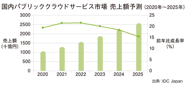 国内のパブリッククラウドサービス市場の拡大は、新型コロナ禍によって加速するという見方が大勢だ。今年3月にIDC Japanは2025年までの市場予測を発表した(グラフ参照)。20年の国内パブリッククラウドサービス市場規模は前年比19.5%増の1兆654億円になったほか、25年の市場規模は20年比2.4倍の2兆5866億円に膨らむという。