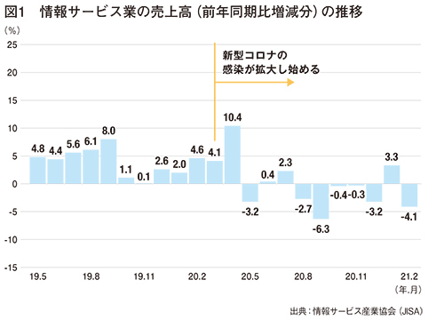 情報サービス産業協会(JISA)が、経済産業省「特定サービス産業動態統計」をもとに集計した情報サービス業の今年2月までの売上高推移を見ると、感染が拡大するに連れて前年同期比でマイナスに振れる月が増え始める(図1参照)。コロナ禍で打撃を受けた業種がIT投資を控えたり、進行中のプロジェクトを縮小・凍結したりした影響が出ているものと推測される。