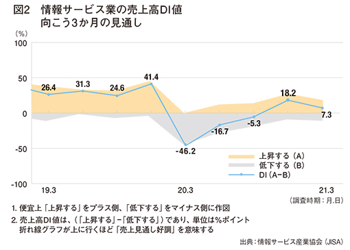 JISAが四半期ごとに主要SIer会員の景気判断を調査している売上高DI調査では、コロナ禍が表面化した20年3月時点では大きく落ち込んだものの、その後は徐々に回復。21年1月以降は「向こう3カ月の売上高が上昇する」と回答したSIer会員が、「低下する」と回答した会員を上回る状態が続いている(図2参照)。売上高上位の大手SIer会員を中心に、コロナ禍初期の厳しい見通しから一転して、売り上げ回復に手応えや期待を持ち始めていることがうかがえる。