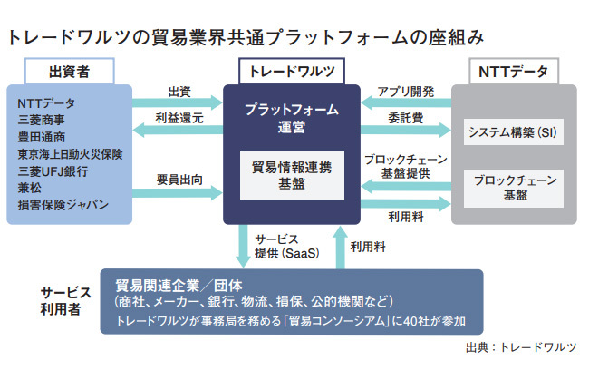 20年11月の事業立ち上げに当たってはNTTデータをはじめ商社、保険会社、銀行など7社が資本参加。また、トレードワルツが運営することになった貿易業務プラットフォーム「TradeWaltz(トレードワルツ)」の開発の方向性を議論するコンソーシアムの参加企業数は今年5月の時点で約40社に増えた(図参照)。