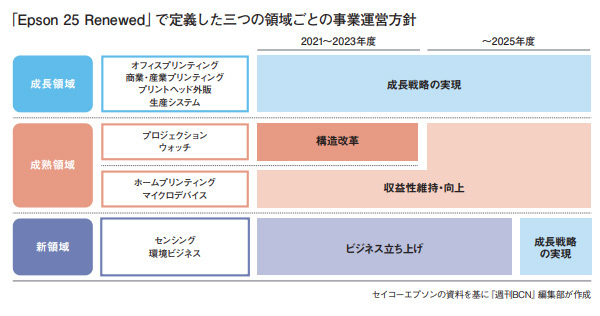 セイコーエプソンは2025年度を最終年度とする長期ビジョン「Epson 25 Renewed」に取り組んでいる。同社の事業を成長領域、成熟領域、新領域に分け、それぞれに合わせたメリハリをつけた事業運営や投資を行い、収益性の確保と将来にわたる成長を目指すことになる。コロナ禍においてペーパーレス化が進展し(関連特集12-13面)、岐路に立つプリンタメーカーとしての新たな挑戦とは――。