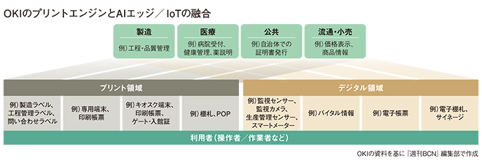 OKIはAIエッジコンピューティングや各種センサーを使ったIoT端末で強みがあり、これらから操作者・作業者に情報を受け渡す役割をプリンタに担わせる。そのほか、病院や自治体のキオスク端末に組み込むプリントエンジンを、小売店舗の棚札作成に応用することなども想定している。「AIエッジ/IoTシステムの構築と歩調を合わせてプリンタエンジンを売り込んでいく」(井上崇・情報機器事業部事業部長)構えだ(図参照)。