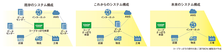 現在、コープさっぽろの情報システムは、同組合の本部を中心にネットワークが構成されている。「データセンターも三つあり、冗長な構成になっている。これをまずはデータセンターを中心としたごく一般的な形に変えようとしている」と若松リーダーは話す。最終的にはインターネットを中心としたネットワーク構成にし、「全てのサーバーをAWSに持っていき、AWS Direct Connectも廃止する。現在使っている統合システム運用管理の『JP1』やADも廃止を目指しており、ここまで行けば理想の世界に近づく」と考えている。(図参照)