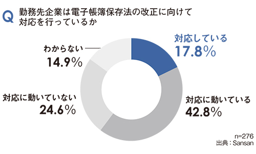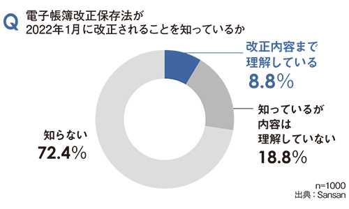企業にとって今回の改正への対応は、単に規則に従うだけにとどまらない意味を持つ。改正内容に即した態勢を取り入れることは、会計や経理のデジタル化加速につながり、ペーパーレス化や業務量の圧縮、リモートワークへの対応強化など幅広いメリットを企業にもたらすからだ。にもかかわらず、企業や働き手の理解は深まっていない。改正電帳法に対応するクラウド請求書受領サービス「Bill One」を展開するSansanが、請求書関連業務に従事する1000人を対象として8月に実施した意識調査によると、「改正内容まで理解している」との回答は8.8%にとどまった。「改正を知っているが内容は理解していない」は18.8%、「改正を知らない」は72.4%にも上り、少なくとも現場レベルでは改正の具体的な中身が浸透していないことが浮き彫りになった。