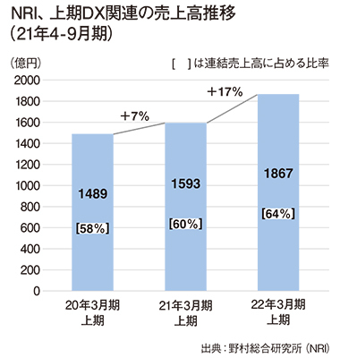 これらDX新領域に関連する上期売上高は前年同期比17%増の1867億円で、全体の64%を占めた。昨年同期が60%、一昨年同期が58%だったのに比べれば、DX関連とNRIが位置づけるビジネスの比率が着実に高まっているのが分かる(図参照)。DX関連の投資の増加は「向こう数年は続く」(此本会長兼社長)と見ている。