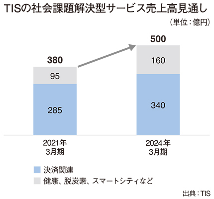 TISの上期(4-9月期)連結売上高は前年同期比10.9%増の2343億円、営業利益は同31.1%増の238億円で、ともに上期としては過去最高を更新した。営業利益率は初の10%超を達成している。「国内IT市場は、DXの文脈におけるIT投資が活況を呈している」(岡本安史社長)といい、国内での事業環境は良好に推移している。一方で、TISの海外ビジネスの主要進出先であるASEANではコロナ禍の影響が依然として続いており、「本格的なIT市場の回復は来年度以降になる」との見通しを示す。24年3月期までの3カ年中期経営計画の重点テーマの一つである「社会課題の解決」では、キャッシュレス決済や健康・医療、脱炭素、スマートシティなどの領域でのビジネス拡大を進めている。同領域で24年3月期までに昨年度(21年3月期)の380億円から500億円規模の売り上げに伸ばす目標を掲げる(図参照)。そのうち7割近い340億円をキャッシュレス決済など金融関連が占める見通し。