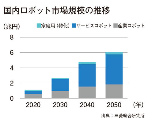 国内に目を向けると、自動運転車や産業用ロボットに関しては、自動車メーカーや産業機械メーカー主導で進むことが予想されるが、サービスロボットの社会実装は「現場やユーザー企業の業務を熟知しているSIer主導でビジネスを伸ばせる余地が大きい」(同)。30年にはサービスロボットの国内市場は産業ロボットと同等規模に成長し、40年にはサービスロボットの市場規模が2倍にまで伸びると、MRIは予測している(図参照)。