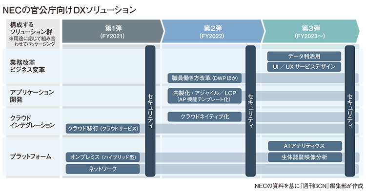 自治体DX市場の立ち上がりを前に、ITベンダーは積極的に手を打ち始めた。NECは1月19日、行政のデジタル化支援に向け、クラウド環境への移行に関するソリューションメニューを「官公庁向けDXソリューション」として体系化し、提供を開始した。四つのソリューション群と連携するセキュリティソリューションで構成され、自治体の目的やセキュリティ要件などに合わせ、短期間でのクラウド移行・運用、アプリケーション開発などを支援する。これまでの行政におけるクラウド構築事例や運用ノウハウなどを、オファリング化して提供する方針だ。
