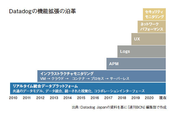 プロダクトとしての「Datadog」は、当初は仮想化基盤をモニタリングの対象とし、その後はクラウドを中心としてきた。現在では対象をコンテナに広げ、さらにプロセス管理やサーバーレスにも対応する。ITインフラが変化し進化する中、Datadogはそれらに応じたモニタリング機能を提供してきた。