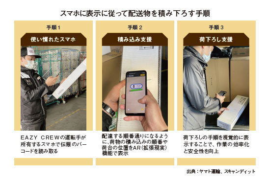 EAZYでは、複数の協力会社に配送業務を委託することから、既存のヤマト運輸社内の情報システムをそのまま使うわけにはいかない。そこで、協力会社のドライバーが個人で使っているスマホに専用アプリを入れてもらうBYOD方式を取り入れた。協力会社のドライバーが所持するスマホのカメラ機能で荷物のバーコードを読み取ると、配達する順番と照らし合わせて、トラックの荷台のどこに積めば最も効率がよいかをスマホの画面に示すようにした(左下図参照)。中核技術はスイスに本社を置くスキャンディットのバーコードの高速・高精度の読み取りとARの技術だ。