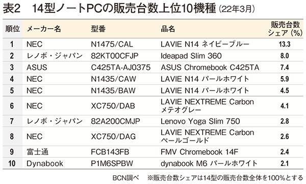 BCNの調査によると、22年3月に量販店で最も売れた14型ノートPCは、NECパーソナルコンピュータ(NECPC)の「LAVIE N14」だ(表2)。同製品は「ちょこっとモバイルPC」として位置付けられ、15型である「LAVIE N15」の「おうちメインPC」、13型の「LAVIE N13」の「軽量モバイルPC」の中間的な利用を狙っている。
