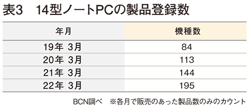 すでに海外では広がりを見せている14型ノートPCだが、ここにきて、日本市場に最適化した付加価値を持った製品も登場している。これも日本の14型ノートPC市場の拡大につながっている要因の一つといえる。BCNのデータでは、販売実績があった14型ノートPCの機種数は、19年3月には84機種だったものが、20年3月には113機種、21年3月には144機種と着実に増えている。22年3月には195機種となり、この3年間で2.3倍に増えている。この1年でも1.4倍となっている。機種数の増加傾向は、14型が15型、13型に続く、重要なカテゴリーの一つに成長しつつあることを意味する(表3)。