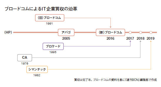 ブロードコムの主力事業は、ネットワーク機器や組み込みシステム向けの半導体チップだ。同社の起源は、61年に立ち上がったヒューレット・パッカードの半導体事業で、事業体の変遷を経て、05年からは独立企業のアバゴ・テクノロジーとして運営されていた。その後アバゴは16年に、同業のブロードコム(旧会社)を370億ドルで買収し、社名を変更した新生ブロードコムとして拡大路線にかじを切る。成立しなかったものの、17年には競合の半導体企業であるクアルコムに1300億ドルという超巨額の買収提案を行うなど、M&Aを成長戦略の中心とする姿勢をより明確化していく。