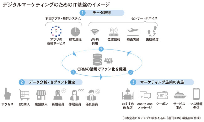 まず、既存のオンラインショップや国際線ターミナルの免税店事前予約サービスに活用してきたスクラッチ開発のCRMをベースに、羽田空港公式アプリ経由で取得した顧客情報も合わせて管理できる基盤を整備。さらに、この顧客情報をさまざまなデータと連携させてマーケティングに活用するための仕組みも整えた(上図参照)。