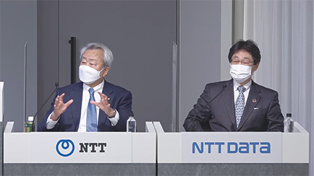 NTTの澤田純社長(左)とNTTデータの本間洋社長