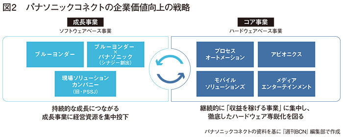 ハードウェアによる「コア事業」に対して、ソフトウェアをベースにした領域を「成長事業」に位置づける。ブルーヨンダー単体での事業成長、ブルーヨンダーとパナソニックによるシナジーの創出、現場ソリューションカンパニーによる国内ソリューション事業の三つが推進役だ(図2参照)。