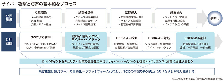 楢原氏によれば、「NISTのCSFをベースに整理すると、サイバー攻撃のプロセスは、メールやWebなどを経由して攻撃を開始した犯罪組織が脆弱性を探索し、非管理端末の乗っ取りやウイルス感染などで初期侵入が成立すると、感染が拡大して事故化する」という流れになる。これに対する防御策としては、攻撃の最前線をファイアウォールや各種フィルタリングなどのゲートウェイで防ぎ、脆弱性探索にはサイバーハイジーン、初期侵入から感染拡大のフェーズはEPP(Endpoint Protection Platform)やEDRによるサイバーレジリエンスで対応することになる(図参照)。
