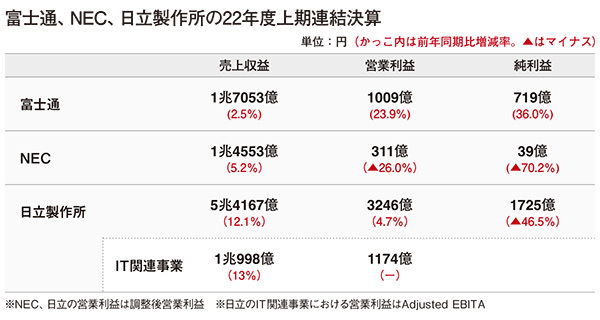 富士通は、売上高にあたる売上収益が前年同期比2.5%増の1兆7053億円、営業利益が23.9%増の1009億円、純利益が36.0%増の719億円で増収増益だった。国内外でシステム構築の受注が拡大したほか、コストの効率化などを進めた一方、部材供給の遅延が増収幅を縮める要因にもなった。