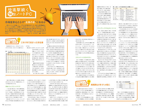 毎号、旬のトレンドにフォーカスする「Special Feature」。Webサイト「週刊BCN+」に掲載された同コーナーの記事中、今年最も多くアクセスされたのは、新たなビジネススタンダードになりつつある「14型」のノートPCに関する特集だ。全国の主要家電量販店・ネットショップの実売データを集計した「BCNランキング」をもとに、成長率や画面サイズ別の構成比、売れ筋モデルを紹介。具体的な市場の状況やPCメーカー各社の戦略から人気を集める理由を探った。