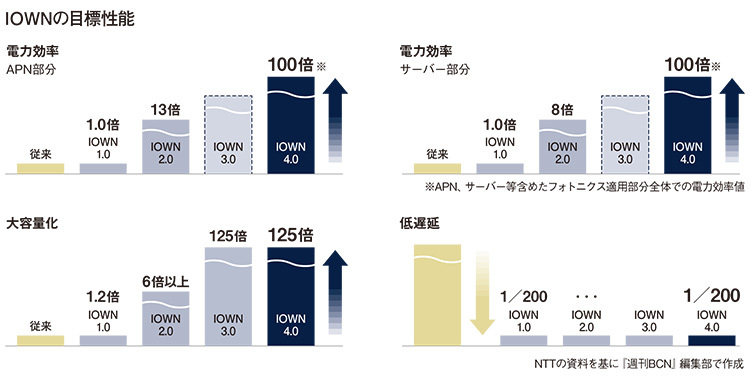 30年度以降には、当面のゴールとして掲げている「IOWN 4.0」へと進化する。第5世代の光電融合デバイスを活用し、チップ内での光接続を可能にし、すでにIOWN1.0で達成している遅延で200分の1というゴールに加えて、電力効率で100倍、大容量化で125倍という長期目標も達成することになる(図参照)。