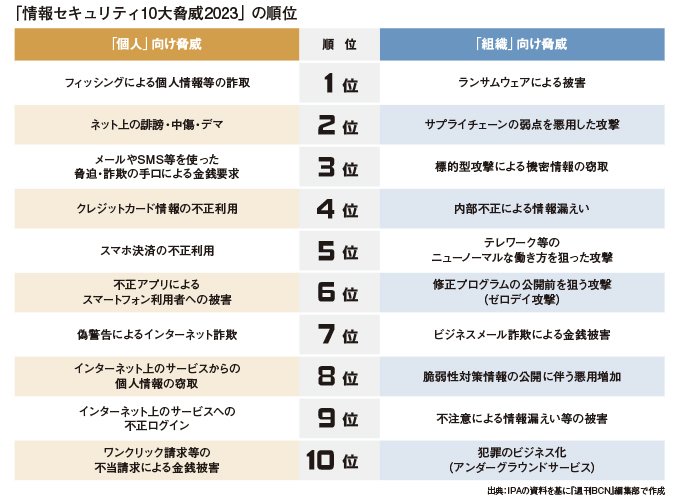 7位の「ビジネスメール詐欺による金銭被害」と9位の「不注意による情報漏えい等の被害」も継続的にランクインしている脅威だ。最近の詐欺メールは、送信元のメールアドレスが、取引先などの本物のメールアドレスと酷似していたり、メール本文が自然な日本語であるため、以前に比べ見分けるのが難しくなっているという。不注意による情報漏えいでは、22年6月に兵庫県尼崎市で全市民約46万人の個人情報が入ったUSBメモリが一時所在不明となった。同市が業務委託していたBIPROGYの、再委託先の協力会社社員がUSBメモリを紛失したことが原因で、後日、無事に発見されたものの、行政のずさんな情報管理に対する批判が集まり、社会的な信用の失墜につながる出来事だった。