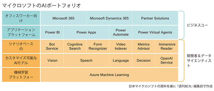 AIポートフォリオを簡単にまとめてみると、先述したMicrosoft 365やDynamics 365、Azure OpenAI Serviceのほか、Vision、Language、SpeechといったSDK、Bot Service、Form Recognizerなどのユースケース製品、シナリオベースのサービスであるAzure Applied AI Service、カスタマイズ可能なAIモデルであるAzure Cognitive Service、機械学習プラットフォームであるAzure Machine Learningなどが挙げられる(表参照)。特にMicrosoft 365 Copilotの登場は、次世代AIの実装を身近に感じられる製品として注目を集めている。