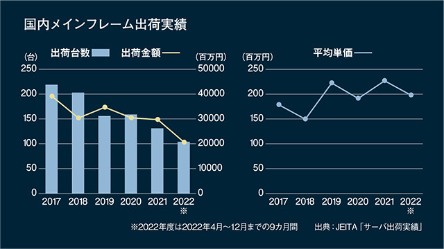 しかし、IAサーバーの出荷金額が前年比7%減、UNIXサーバーが前年比18%減、PCが前年比21%減であったことに比較すると、メインフレームの2%減というマイナスは最も落ち込みが少ない。さらに、最新データである22年度第3四半期累計(22年4月~12月)の実績では、出荷台数が前年比13%増、出荷金額は6%増と前年実績を上回る水準で推移している。