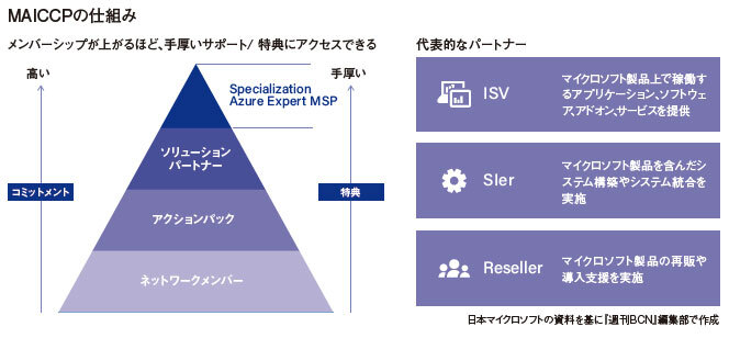 マイクロソフトは従来、パートナーのビジネスを支援するためのプログラムをグローバルで実施してきた。国内でも多くのITサービス系企業が、プログラムを活用してビジネスを展開している。プログラムのメンバーシップはピラミッド型の複数階層で構成され(図参照)、それぞれの段階に応じて「販売連携」「製品ライセンスの利用特典」「技術スキル取得支援」「インセンティブ」といったサポートが提供される。
