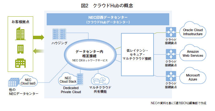 そしてクラウドHubDCは、NECのDC事業における成長領域となる。クラウドHubDCでは、メガクラウド事業者との接続性を重視したデータセンターとして展開。クラウド基盤とのハブ機能を提供し、同社が推進するインターコネクテッドエコシステムの形成や、エコシステムパートナーとの接続をシームレスに実現する(図2参照)。